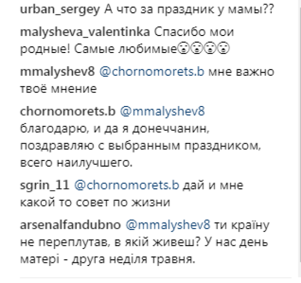 Да ладно вам, парень хотел сделать приятное маме. Может он не самый интеллектуал, увидел в ленте новостей, что День Матери, и бегом маму поздравлять. Мой отец в прошлом году увидел в белорусских новостях, про день матери и стал всех мам с днем матери (Беларуси) поздравлять. Так и Малышев, ну глупый, может тупанул, хотя мож и сепар, но его маме приятно)