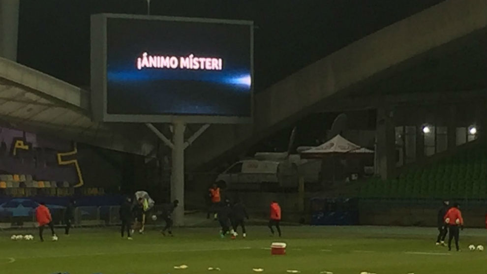 "Севилья" готовится к заключительному матчу группового этапа Лиги чемпионов против "Марибора". Во время тренировки испанской команды на табло стадиона загорелась надпись "Удачи, тренер!", посвященная Эдуардо Бериццо, наставнику севильцев, который борется с раком.