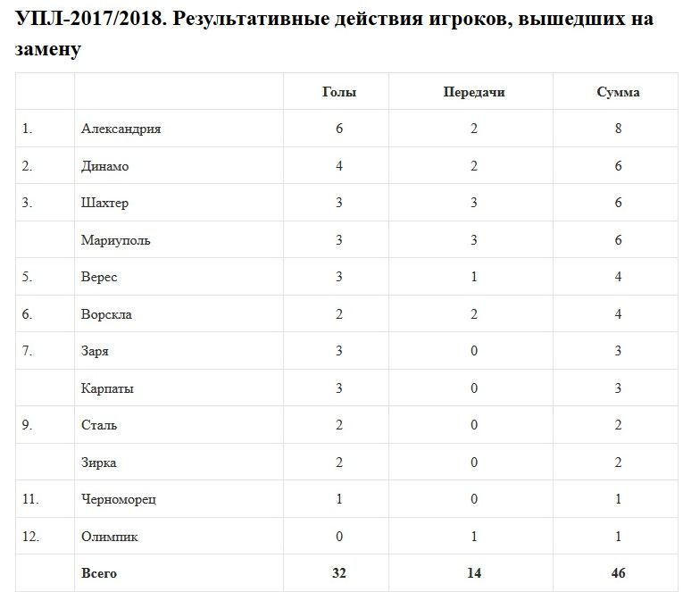 В клубном зачете лидирует главный тренер Александрии Владимир Шаран. Футболисты, которых он выпускал на замену, забили шесть мячей (треть всех голов в чемпионате) и отдали два голевых паса. Тут, правда, стоит задуматься, насколько удачными были эти ходы наставника. Все-таки турнирные дела у александрийцев пока складываются не очень хорошо, а это значит, что наставник, возможно, не всегда попадает в точку с основным составом. Кстати, на втором месте по количеству голов джокеров — главный тренер Динамо Александр Хацкевич. Сегодня киевляне сыграют как раз в Александрии, поэтому ждем в этом матче результативных замен.