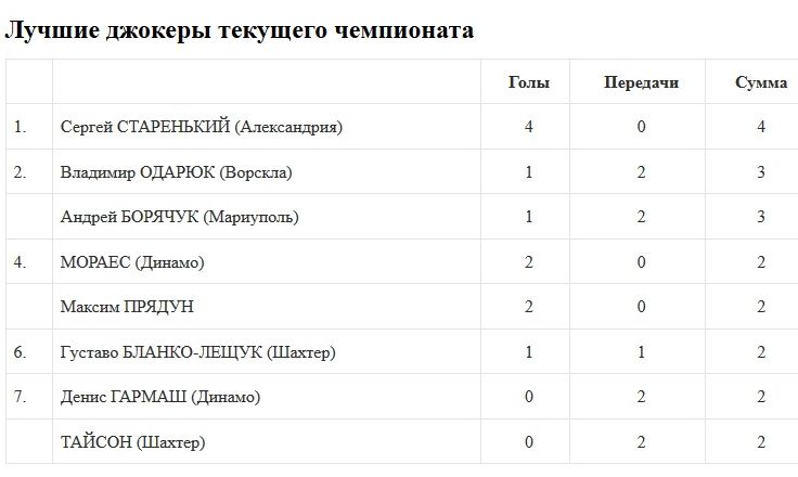 Всего в текущем сезоне джокеры забили 32 мяча — каждый восьмой гол. В индивидуальном зачете лидирует полузащитник Александрии Сергей Старенький, который дважды удачно выходил на замену (один раз оформил хет-трик).