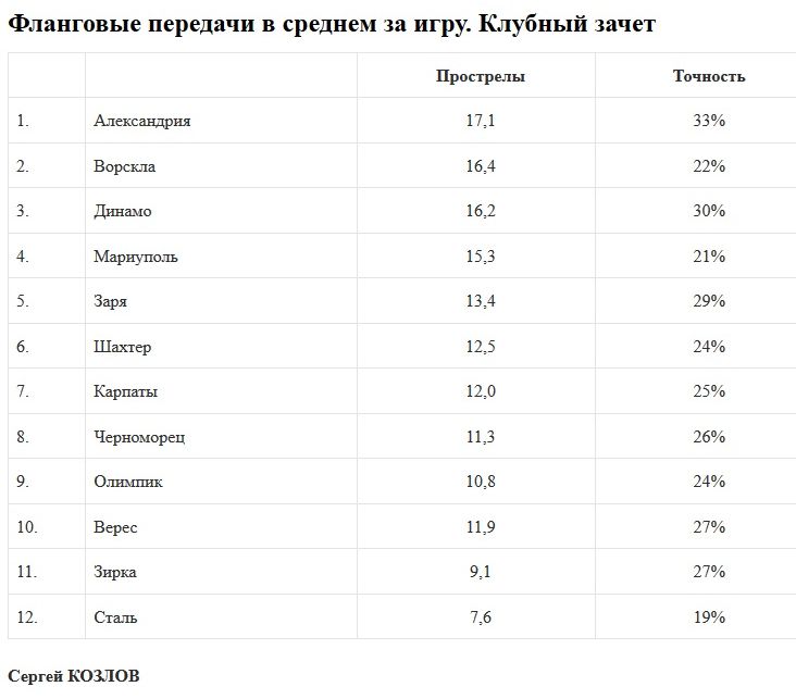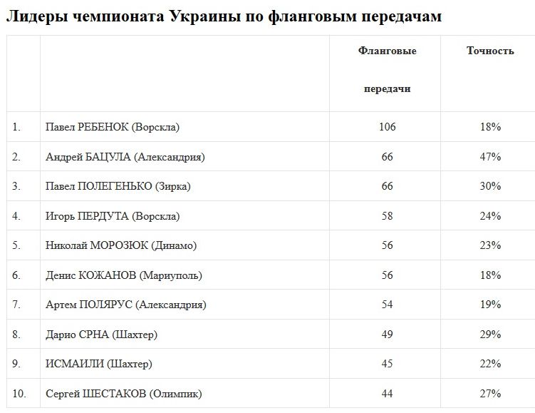 Фланговые атаки принесли Ворскле в текущем чемпионате половину всех забитых мячей, а ее полузащитник Павел Ребенок лидирует по количеству прострелов в УПЛ. При этом возглавляет еще и список лучших ассистентов первенства. По статистике футболиста хорошо видно, что берет он, как и вся его команда, не столько качеством, сколько количеством, но такая тактика, в общем-то, оправданна. В пятерку лучших игроков лиги по числу фланговых передач входит еще один представитель полтавского коллектива — Игорь Пердута. Обратим внимание на высокую точность прострелов в исполнении универсального игрока Александрии Андрея Бацулы, который действует и в обороне, и в полузащите.