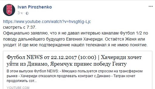 "Официально заявляю, что я не давал интервью каналам Футбол 1/2 по поводу дальнейшего будущего Евгения Хачериди. Остаётся Женя или уходит. И где мое подтверждение нашёл телеканал я не имею понятие", - написал Пироженко.