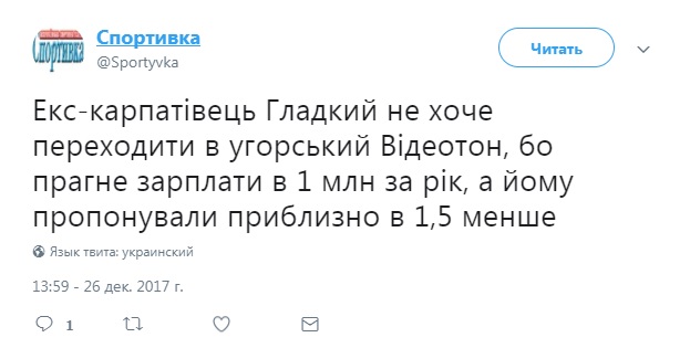 Как сообщает газета «Спортивка» на своей странице в Твиттере, экс-форвард «Шахтера», «Днепра», «Металлиста», «Динамо», «Карпат» и сборной Украины Александр Гладкий отказался переходить в венгерский клуб.