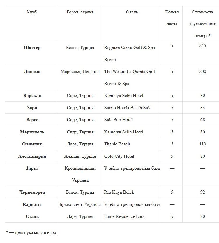 Естественно, возможно, что некоторые из команд сумели добиться скидок или других преференций в отелях, где они остановились, но в общем стоимость проживания украинских коллективов на турецких и испанских сборах ясна.