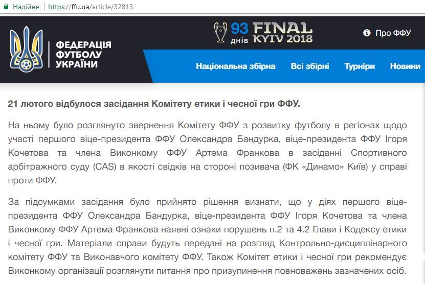 По итогам заседания было принято решение признать, что в действиях первого вице-президента ФФУ Александра Бандурко, вице-президента ФФУ Игоря Кочетова и члена Исполкома ФФУ Артема Франко имеются признаки нарушений п.2 и 4.2 главы и Кодекса этики и честной игры. Материалы дела будут переданы на рассмотрение Контрольно-дисциплинарного комитета ФФУ и Исполнительного комитета ФФУ. Также Комитет этики и честной игры рекомендует Исполкома организации рассмотреть вопрос о приостановлении полномочий указанных лиц, - говорится в заявлении на официальном сайте ФФУ.