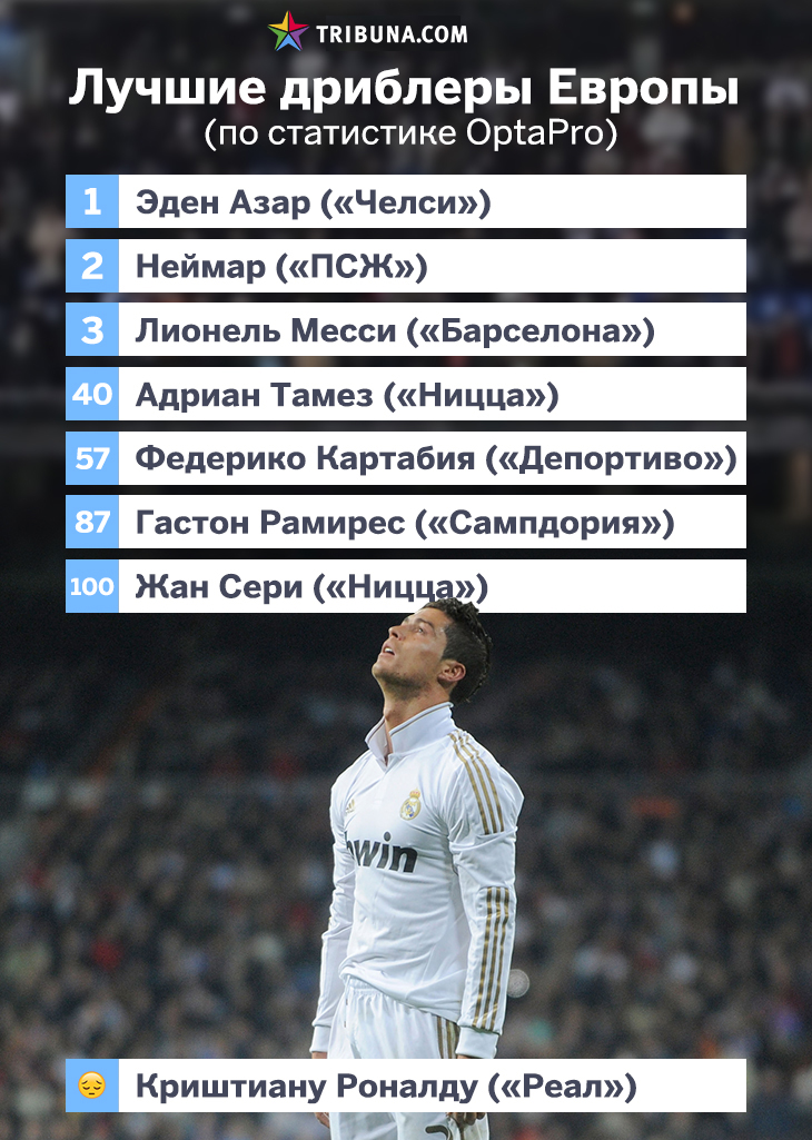 Роналду не попал в топ-100 дриблеров Европы. Лучший - Азар