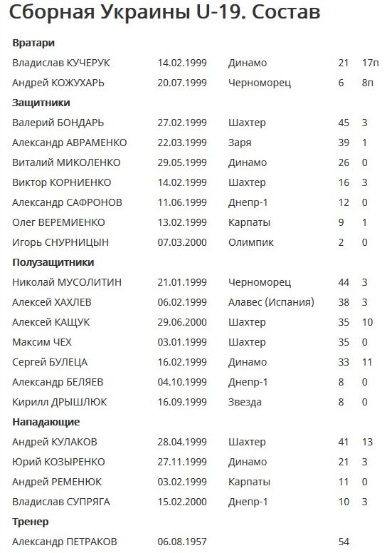 Был в числе вызванных на игры с греками также защитник Виталий Миколенко (Динамо), но не играл. Сейчас он — вновь в списке. А вот его одноклубник Денис Попов давно не выступает из-за травмы. Нет в этой сборной и лучшего футболиста Украины U-19 по итогам референдума проекта Золотой Талант 2017 года Андрея Лунина. Он — в национальной команде у Андрея Шевченко.