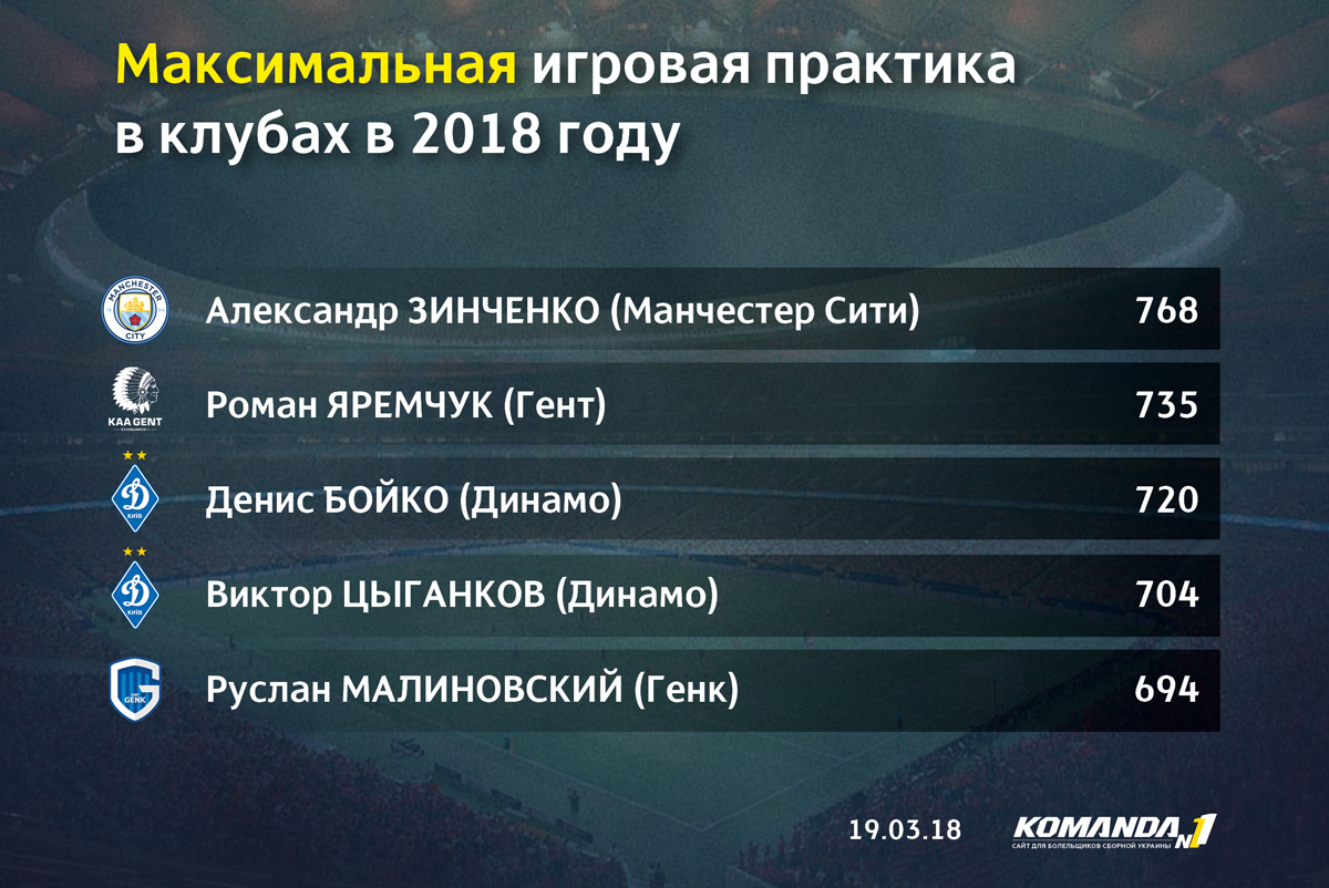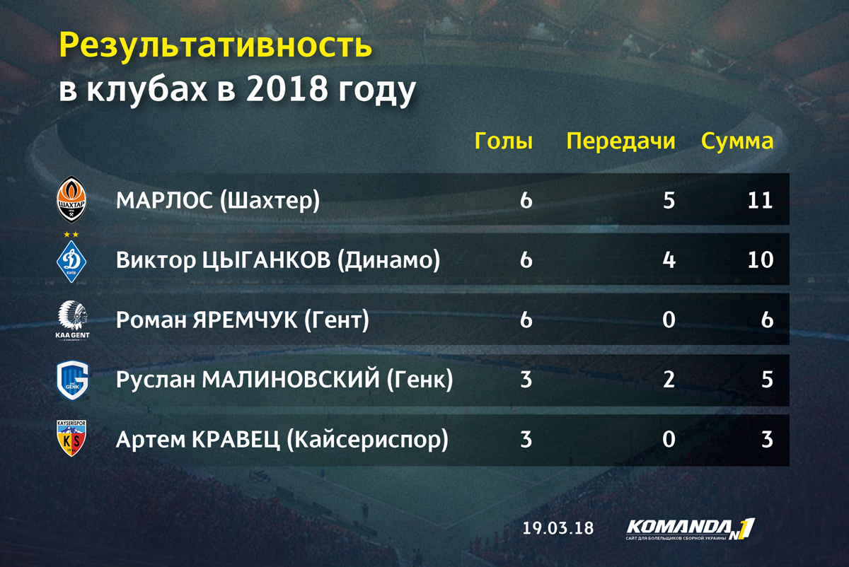 Лидером сборной по количеству игровых минут в этом году является Александр Зинченко, который еще не так давно, напротив, ходил в аутсайдерах по этому показателю. Сразу три футболиста возглавляют список лучших бомбардиров в этом году, но уже вскоре команду покинет Роман Яремчук и получится, что все наши сборники забили в 2018 году 23 мяча. Больше половины из них на счету Марлоса и Виктора Цыганкова. Посмотрим, кто из них станет автором первого гола национальной команды в 2018 году…