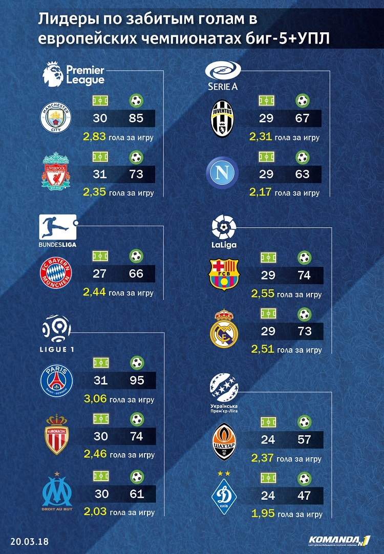 Лидеры по забитым мячам в топ-5 европейских чемпионатах и Премьер-лига: "Динамо" чуть-чуть не дотягивает до "Марселя"