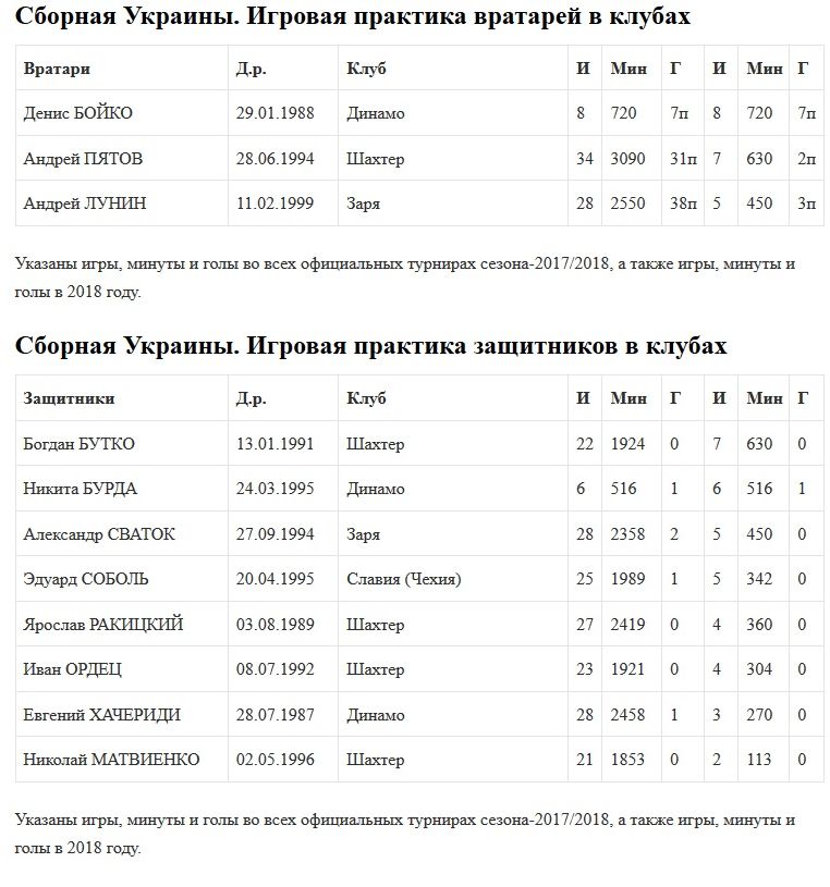 В тренировочный лагерь национальной команды Украины футболисты приехали с разным объемом игровой практики в клубах. Минимальные показатели в матчах 2018 года имеют Иван Петряк и Николай Матвиенко из Шахтера. В Заре и Ворскле они проводили на поле гораздо больше времени.