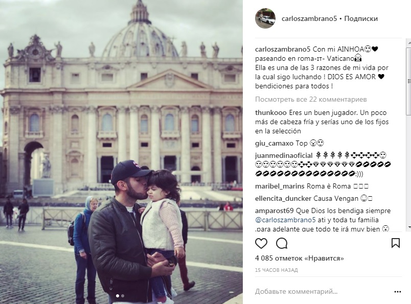 Карлос Самбрано поделился трогательным фото в Инстаграм. "С моей Айноа. В Риме - Ватикан. Она - одна из 3 причин моей жизни, благодаря которой я продолжаю бороться. Бог есть любовь. Благословения вам всем!" - написал Самбрано.