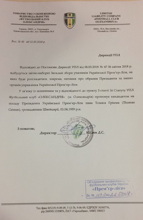 Как стало известно Tribuna.com, «Александрия» выдвинула экс-главу швейцарской лиги Томаса Гримма на пост президента УПЛ.