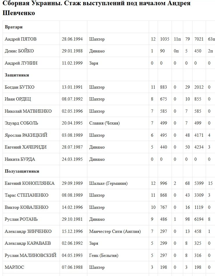 Отметим также, что на этот раз не оказалось в составе четырех футболистов, сыгравших под началом нынешнего наставника более 180 минут. Это ее лучший бомбардир Андрей Ярмоленко (13 матчей, 1061 минута, 8 голов), Александр Кучер (6 матчей, 495 минут), Сергей Сидорчук (7 матчей, 323 минуты) и Сергей Кривцов (3 матча, 225 минут).