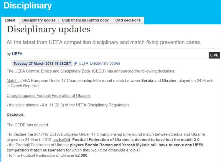 Официальный сайт УЕФА обнародовал информацию о присуждении сборной Украины (U-17) технического поражения в матче квалификации Евро-2018 против Сербии. Причина — участие в поединке Николая Яроша и Романа Бодни, которые в предыдущих встречах с Ирландией и Испанией получили желтые карточки. Согласно регламенту соревнования, игрок подвергается одноматчевой дисквалификации после второго горчичника.