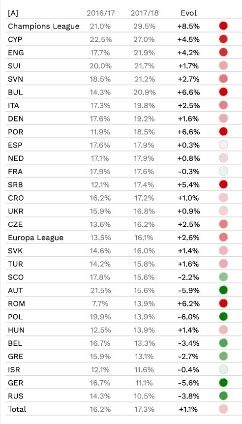 Що цікаво, цього разу фахівці CIES узяли до уваги не тільки національні Ліги, а і єврокубки. Й от що вийшло: турніром, де найбільший відсоток розгромів, стала… Ліга чемпіонів УЄФА: майже кожен третій (29,5%) поєдинок головного змагання континенту дає чийсь виграш із різницею три й більше м’ячів.