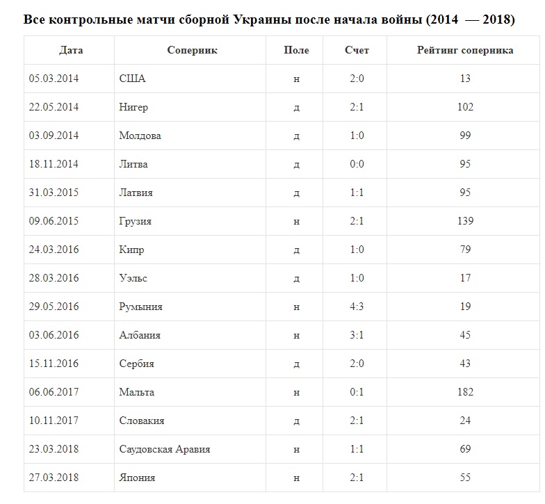 Впрочем, самое парадоксальное заключается в том, что за все эти годы сборная Украины не провела ни одного контрольного матча… на выезде. Ладно, к нам не хотят ехать, но почему нас не зовут? В настоящий момент приходиться констатировать, что шесть из последних 10-ти спаррингов сине-желтые провели на нейтральном поле. Сыграют ближайшие два поединка в Швейцарии (с Марокко — 30 мая и Албанией — 2 июня) — будет восемь из 10-ти!