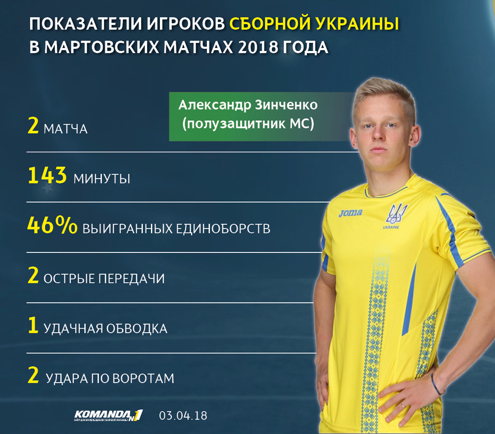 Тяжело сказать. Показал хорошую заряженность на борьбу и, скорее всего, правильно выдерживал структуру нашей игры. Постоянно строил треугольники с ближними партнерами и продемонстрировал высокую точность передач (по сумме двух матчей — 85%). Но! За 143 минуты отдал всего две острые передачи и лишь один раз пытался доставить мяч в штрафную площадь. Только 20% своих пасов адресовал в финальную треть поля. Болельщики могут не понимать всех тактических премудростей в игре сборной Украины, но их не устраивает статистика атакующего полузащитника команды — в 15-ти матчах за национальную сборную Александр Зинченко забил один мяч и отдал одну голевую передачу. В этом плане нужно прибавлять.