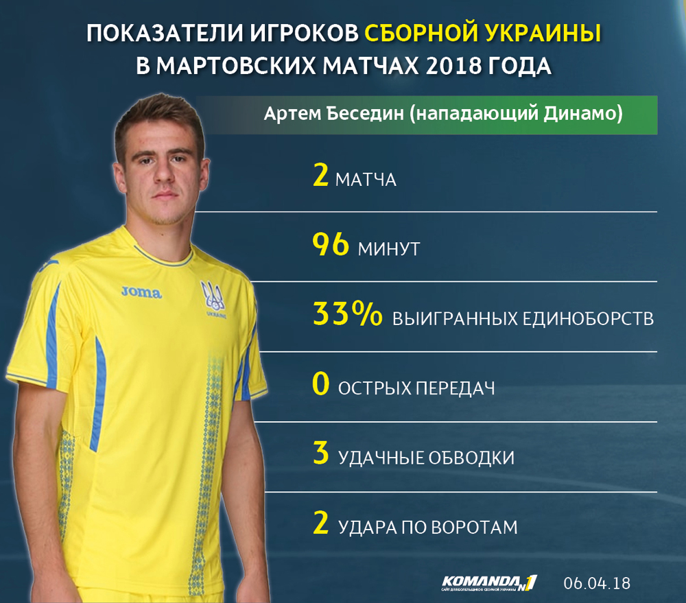 В двух недавних контрольных матчах главный тренер сборной Украины Андрей Шевченко задействовал 20 исполнителей. Мы решили подробно остановиться на действиях каждого из них и проанализировать их клубные перспективы. На очереди — нападающий Артем Беседин, который вышел на замену во встрече с Саудовской Аравией и провел весь поединок против Японии.