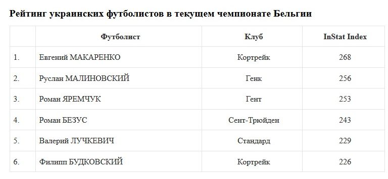 Компания InStat обнародовала рейтинги самых полезных игроков первого этапа чемпионата Бельгии. По итогам 30-ти туров украинские футболисты занимают там видные места. Так, центральный полузащитник Кортрейка Евгений Макаренко входит в топ-20 лучших исполнителей бельгийской лиги. Его InStat Index составляет 268 баллов, а это17-й результат среди всех участников турнира и третий — среди опорных хавбеков.