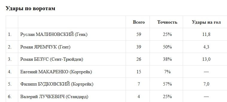 Если исходить из средних показателей, то в число лучших дриблеров чемпионата Бельгии входит Роман Безус — в среднем 9,1 обводки за игру. Кроме того, у полузащитника Сент-Трюйдена почти по четыре острых паса за матч. Довольно высокий показатель выигранных единоборств у нападающего Гента Романа Яремчука. В общем, украинские футболисты в Бельгии, за редким исключением, выступают на хорошем уровне.
