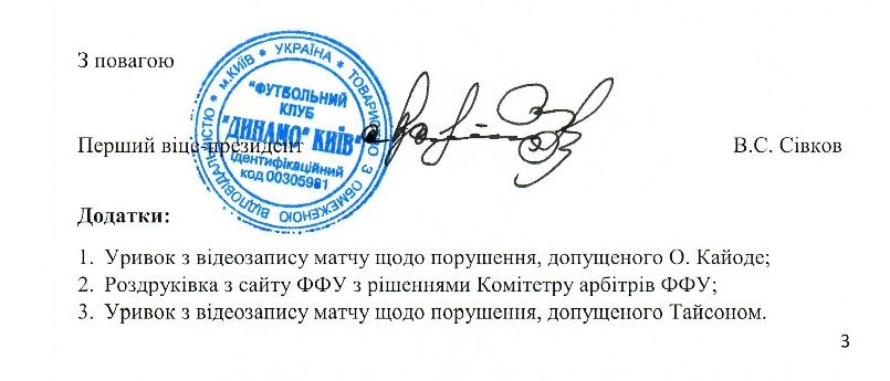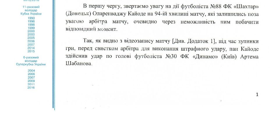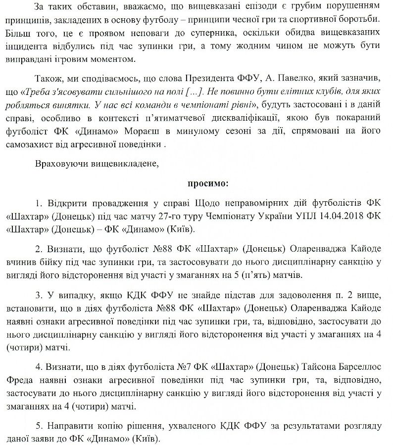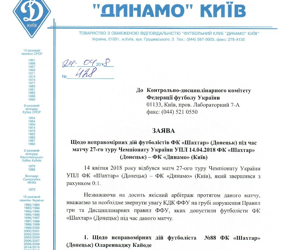 Футбольный клуб «Динамо» Киев отправил в КДК ФФУ письмо с заявлением о неправомерных действиях футболистов ФК «Шахтер» (Донецк) во время матча 27-го тура Чемпионата Украины УПЛ сезона 2017/2018 «Шахтер» - «Динамо».