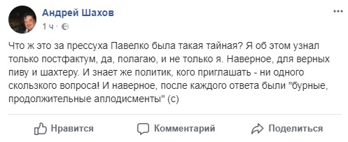 - Что ж это за прессуха Павелко была такая тайная? Я об этом узнал только постфактум, да, полагаю, и не только я. Наверное, для верных пиву и шахтеру. И знает же политик, кого приглашать - ни одного скользкого вопроса! И наверное, после каждого ответа были "бурные, продолжительные аплодисменты" (с) – написал Шахов на своей странице на Фейсбуке.