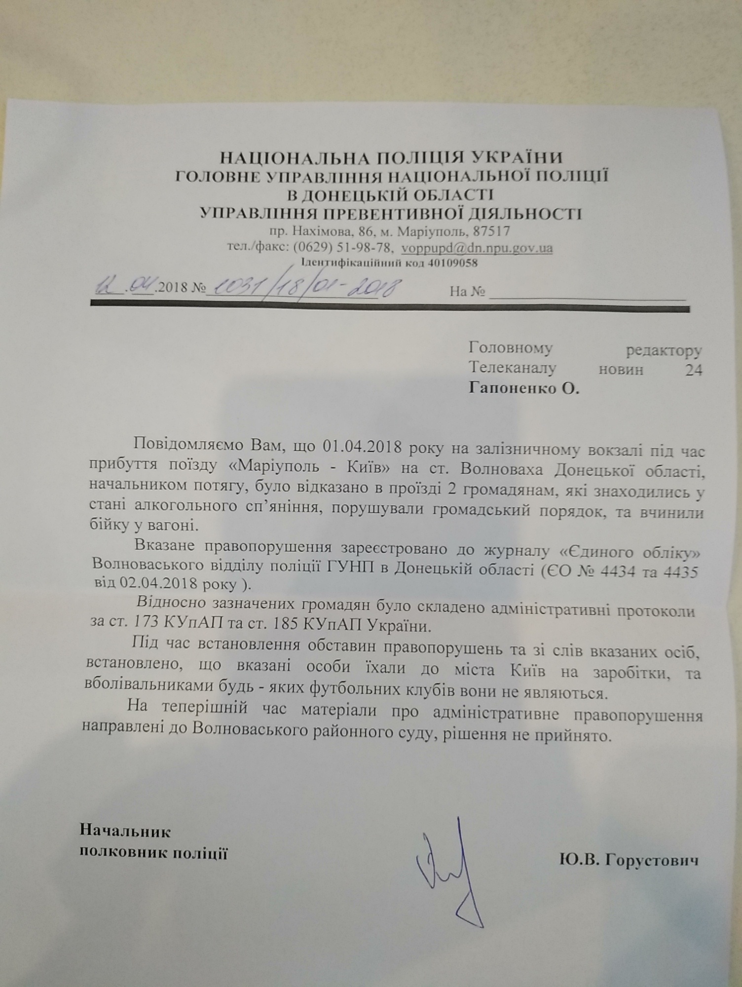 Як я і обіцяв, прошу вибачення в разі, якщо виявиться, що після з’ясування обставин ми написали неправду про двох громадян, що вчинили бійку в потягу після матчу Маріуполь – Динамо.