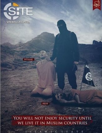 Террористическая группировка ИГИЛ распространяет в Интернете новые плакаты с угрозами атак во время ЧМ-2018. На этот раз в качестве героев плакатов террористов выступила сборная России, а также лидеры сборных Бразилии и Аргентины Неймар и Лионель Месси соответственно, сообщает The Mirror.