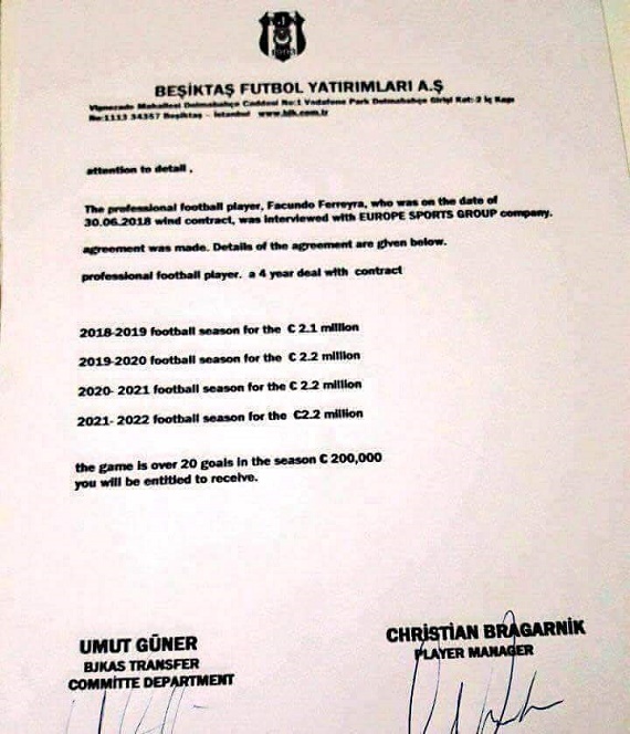 В СМИ появились данные, согласно которым форвард "Шахтера" Факундо Феррейра следующие четыре сезона будет выступать за стамбульский "Бешикташ". В письме, которое подписано спортивным директором клуба Умутом Гюнером и представителем футболиста Кристианом Брагарником, идет речь о том, что по контракту Феррейра будет получать в среднем 2,15 миллиона евро в год, а также получит бонус размером в 200 тысяч евро, если сможет отличиться более 20 раз за сезон.
