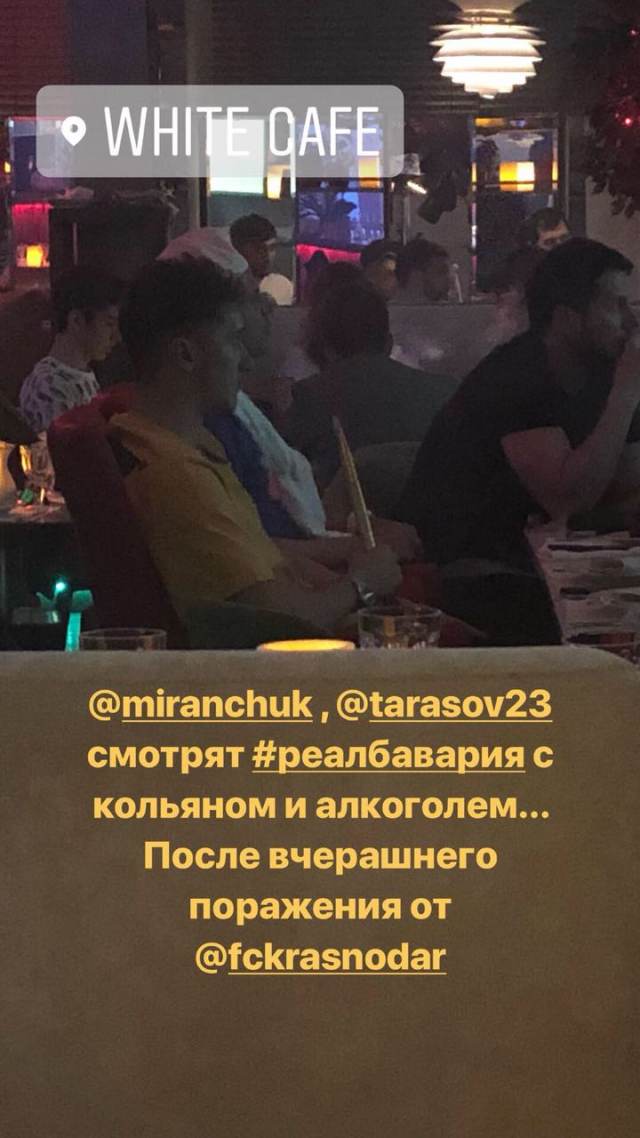 "Смотрю – закурили кальян (с Тарасовым были его партнеры по Локомотиву – братья Миранчукы, – прим.). Алкогольный или нет – не знаю. А когда Тарасов начал еще и шоты употреблять... Мне стало обидно, что такое вообще возможно. Они же накануне должны были становиться чемпионами.