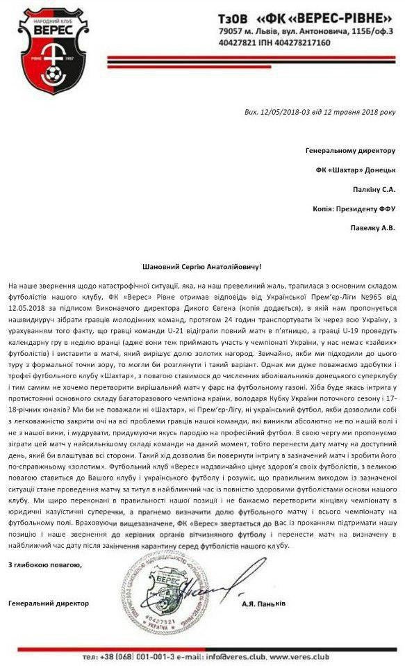 Верес направил письмо генеральному директору Шахтера Сергею Палкину и президенту ФФУ Андрею Павелко с просьбой перенести поединок между ровенчанами и "горняками" на другую дату, сообщает официальный сайт клуба.