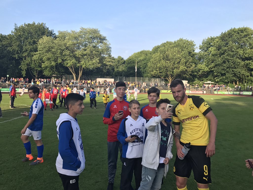 Нападающий дортмундской "Боруссии" Андрей Ярмоленко пользуется популярностью не только в Украине, но и в Германии. После товарищеского матча с любительским клубом, юные болельщики выстроились в очередь, чтобы сделать селфи с украинским футболистом. Андрей с удовольствием уделил внимание всем желающим.