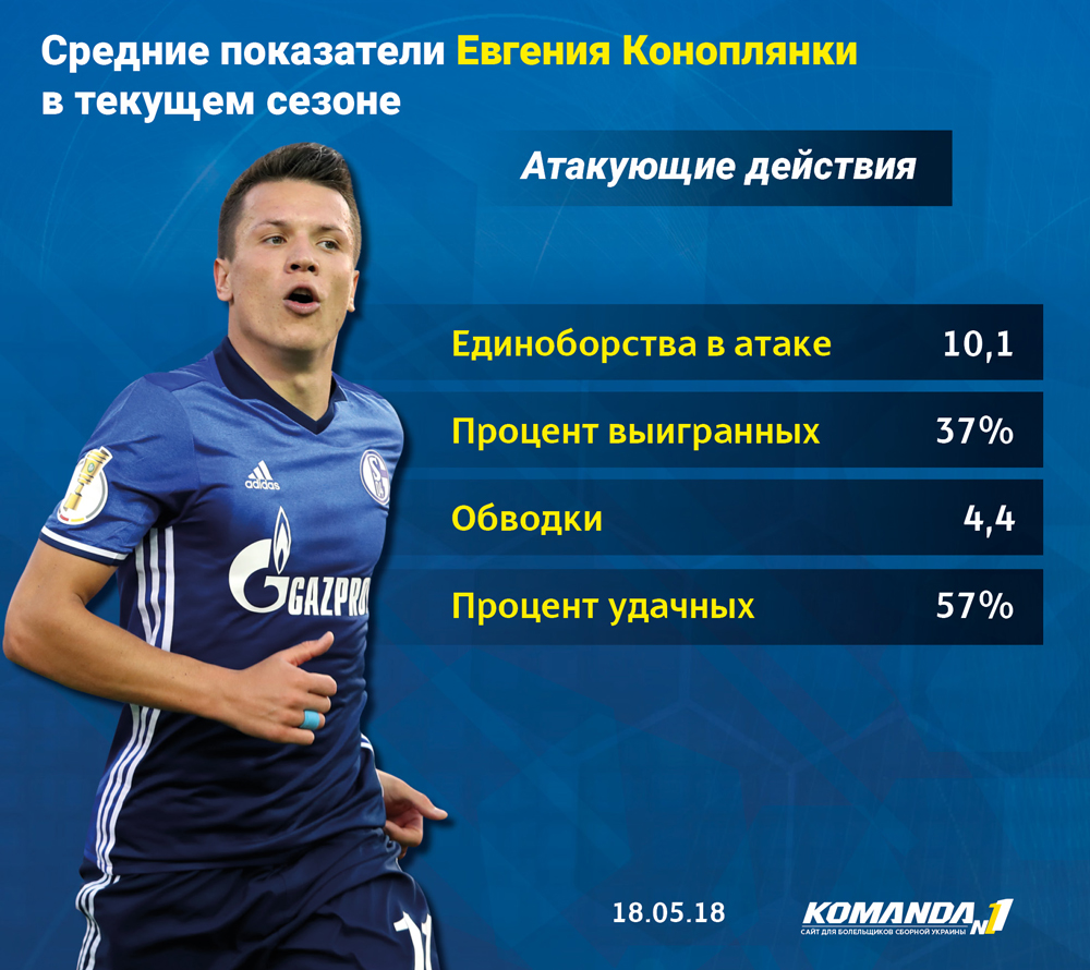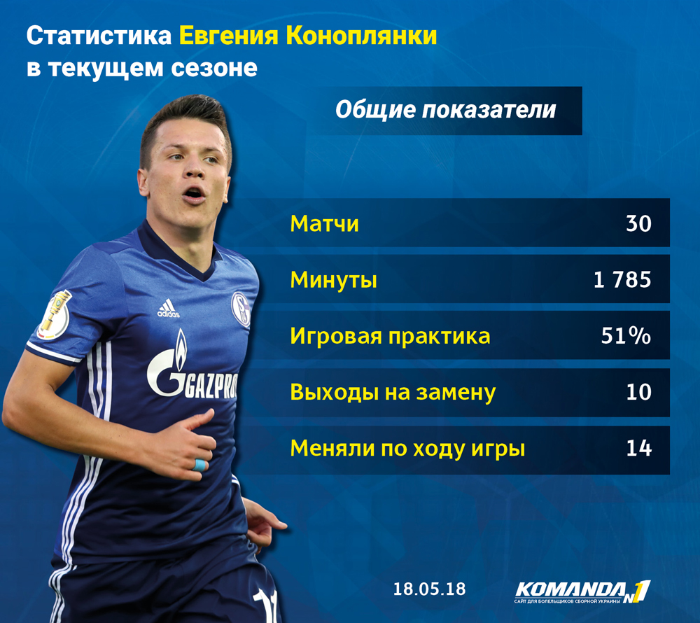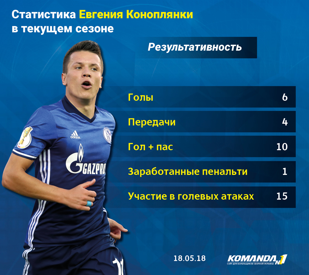 Нельзя сказать, что три десятка матчей за сезон — для Коноплянки это много. После 52-х поединков в позапрошлом сезоне в Севилье — вообще сущая ерунда. Но после 26% игровой практики в Шальке в прошлом году нынешний 51% выглядит настоящим прорывом! Другой вопрос, что забивать больше Евгений не стал — те же шесть мячей, что и в прошлом сезоне. Вот только участий в голевых атаках заметно выросло. По этому показателю наш футболист занял третье место среди всех игроков своего коллектива.
