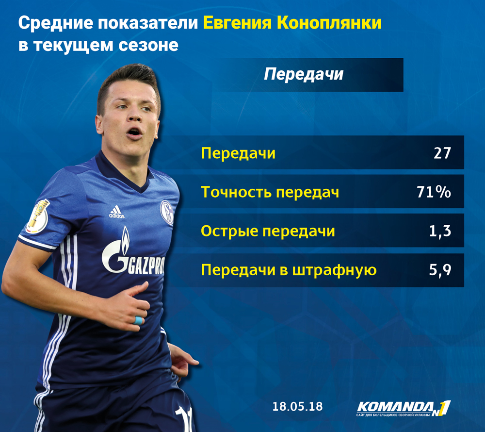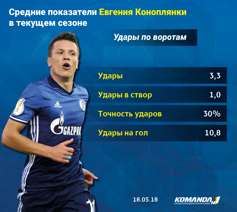 При всем своем футбольном эгоизме Евгений Коноплянка стал больше работать на команду. Ударов у него по-прежнему много (по общему их числу — 19-е место в бундеслиге), но их все равно меньше, чем было. Над точностью нужно, конечно, работать: 30% попаданий в створ — это никуда не годится. По количеству выстрелов полузащитник сборной Украины занимает первое место в Шальке, а по их точности — 12-е!