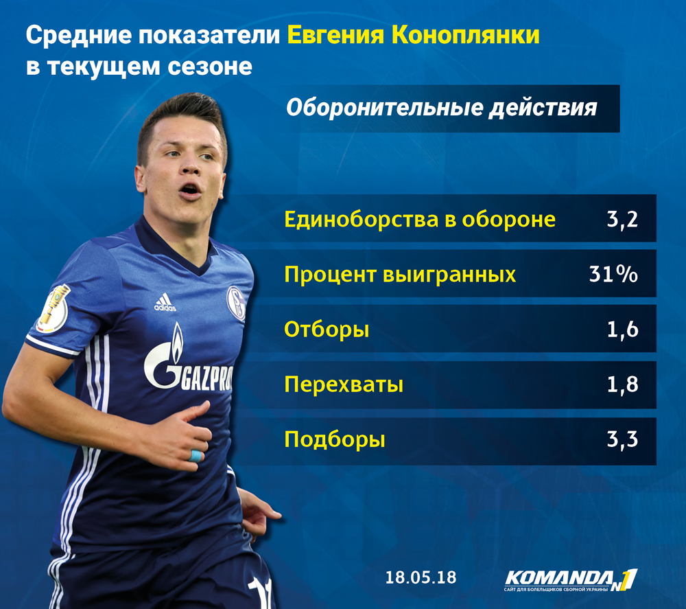 В обороне у украинца очень мало единоборств — по числу таких действий он вообще худший футболист Шальке! В этом, кажется, и есть главный резерв Евгения Коноплянки, но вот уже много лет он никак не может его включить. Прибавляет в чем-то другом, цепляется за свой шанс, проявляет характер, но пока не тянет на первую скрипку своей команды. На финише сезона полузащитник сборной Украины набрал отличную форму, но и это не помогло ему попасть в десятку самых полезных исполнителей Шальке. Мы понимаем, что уровень этой команды сейчас — второе место в бундеслиге. Но все равно ждем от него чего-то большего. Правда?
