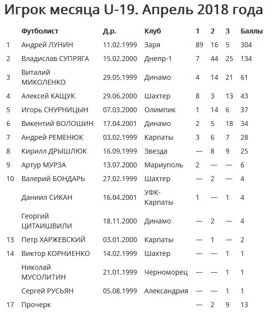 Вратарь Зари и национальной сборной Украины Андрей Лунин второй раз в 2018 году признан лучшим футболистом месяца страны в категории U-19 в рамках проекта Золотой Талант, и опять — безоговорочно