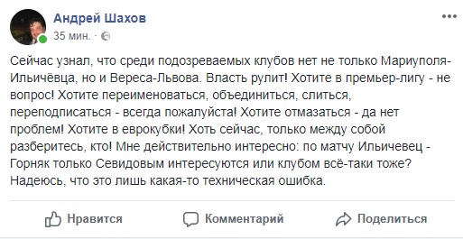 - Сейчас узнал, что среди подозреваемых клубов нет не только Мариуполя-Ильичёвца, но и Вереса-Львова. Власть рулит! Хотите в премьер-лигу - не вопрос! Хотите переименоваться, объединиться, слиться, переподписаться - всегда пожалуйста! Хотите отмазаться - да нет проблем! Хотите в еврокубки! Хоть сейчас, только между собой разберитесь, кто! Мне действительно интересно: по матчу Ильичевец - Горняк только Севидовым интересуются или клубом всё-таки тоже? Надеюсь, что это лишь какая-то техническая ошибка, - написал Шахов на своей странице в Фейсбуке.