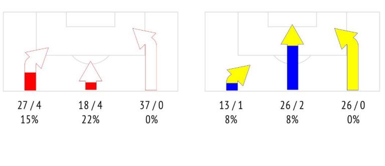 На чужую половину поля выходили плохо, хотя несколько быстрых атак были очень показательными. Но этого недостаточно. Посмотрите на сравнение предпосылок для контратак обеих команд — обратите внимание, в каких зонах соперники могли начинать стремительные выпады. Второй момент — наши фланги. Крайние защитники сборной Украины не сделали в этом матче ни одной (!) точной передачи в штрафную площадь соперника. Стандартные положения вообще заслуживают отдельного анализа: не идут они у нас — хоть ты тресни! Один удар из 11-ти розыгрышей — это полный провал. Нужно что-то менять, повышать эффективность.