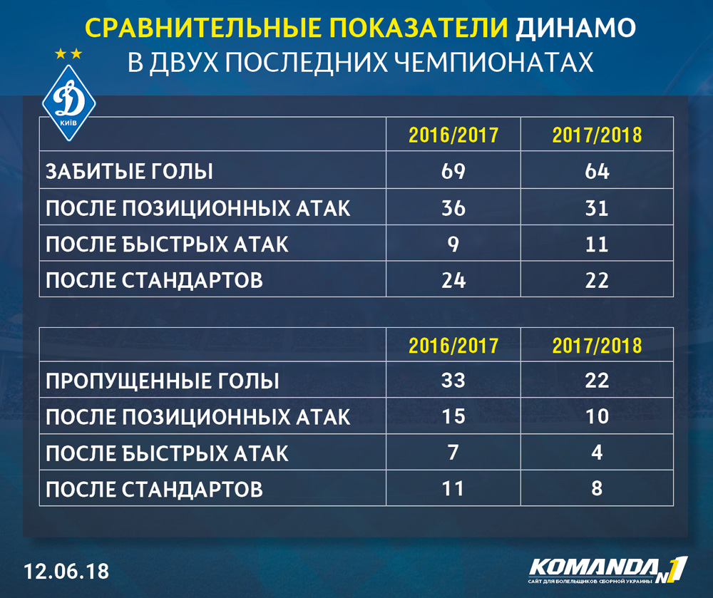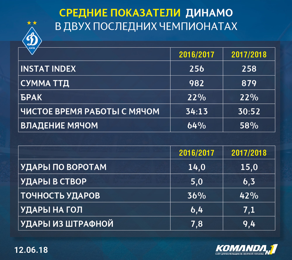 Динамовцы стали чуть хуже реализовывать стандартные положения, но по-прежнему остались лучшей командой Украины в этом компоненте. Увеличилось число забитых мячей после быстрых атак, но разница не такая уж и существенная, особенно с учетом того, что команда на три с лишним минуты чистого игрового времени стала меньше работать с мячом. У динамовцев существенно снизилось количество ТТД, но это произошло во много благодаря тому, что уменьшилось число передач — того самого контроля мяча. Острых передач больше не стало, а вот количество ударов немного выросло.