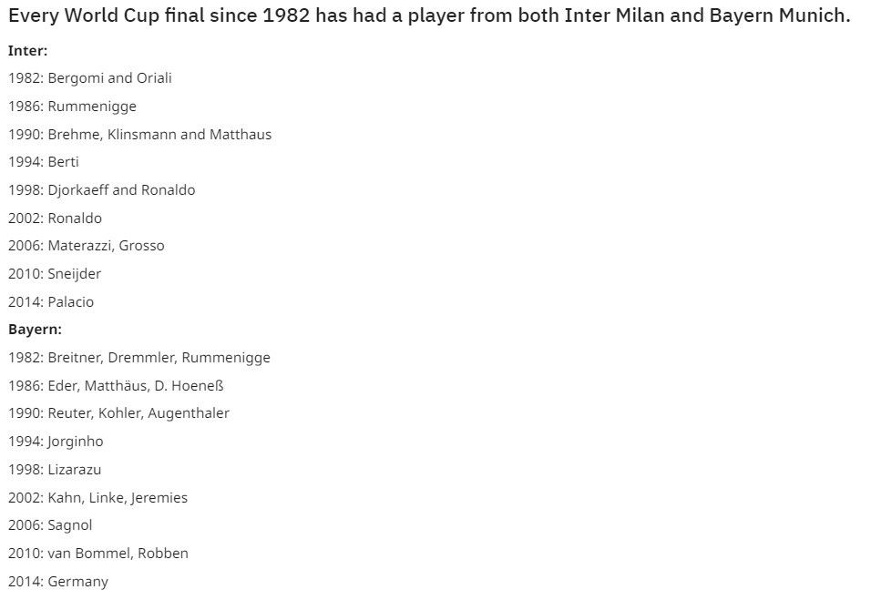 Начиная с ЧМ-1982 в финалах обязательно играл хотя бы один футболист мюнхенской «Баварии» и хотя бы один футболист миланского «Интера».