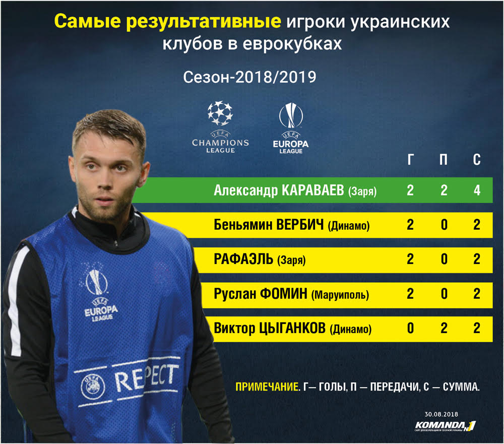 В ответном поединке плей-офф раунда Лиги Европы против Лейпцига полузащитник Зари Александр Караваев отметился двумя результативными передачами, и теперь в его активе четыре очка по системе гол + пас. Это лучший результат нынешнего еврокубкового сезона для футболистов, выступающих в украинских клубах. Напомним, что Заря и Мариуполь провели по четыре игры в ЛЕ, а Динамо — столько же в Лиге чемпионов.