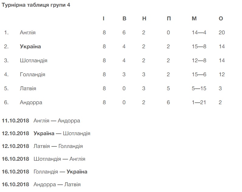 Підопічним Олександра Головка залишилося провести два поєдинки: 12 жовтня — в Києві на «Оболонь-Арені» зі збірною Шотландії та 16 жовтня — в Дутінхемі з командою Голландії. І якщо для того, щоб фінішувати на другому місці в групі, синьо-жовтим вистачить чотирьох очок (а в теорії за певних обставин — навіть і трьох, і двох), то аби претендувати на потрапляння до четвірки найкращих других збірних, їм необхідні дві перемоги. 14 золотих очок дозволять нам стежити за перебігом подій в інших групах і сподіватися на свій шанс.