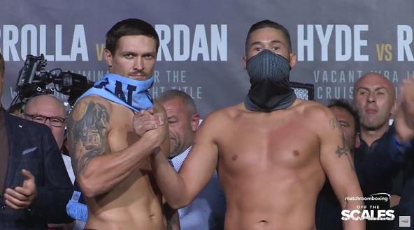 Известный украинский боксер Александр Усик вышел на взвешивание перед боем против Тони Белью в шарфике обидчика Шахтера Манчестер Сити.