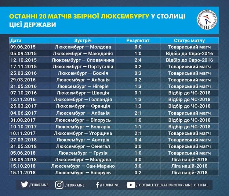 Цікаво, що останнім часом наш суперник доволі вдало виступає на стадіоні «Жозі Бартель». В останніх 10-ти поєдинках у столиці люксембуржці зазнали лише двох поразок — від Австрії та Білорусі.