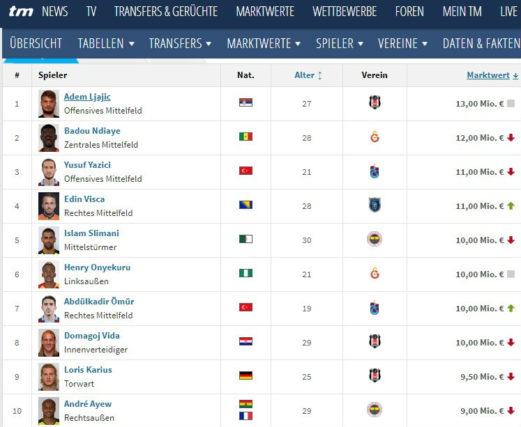 Авторитетный портал transfermarkt.de обновил информацию по стоимости футболистов, выступающих в турецкой Суперлиге.