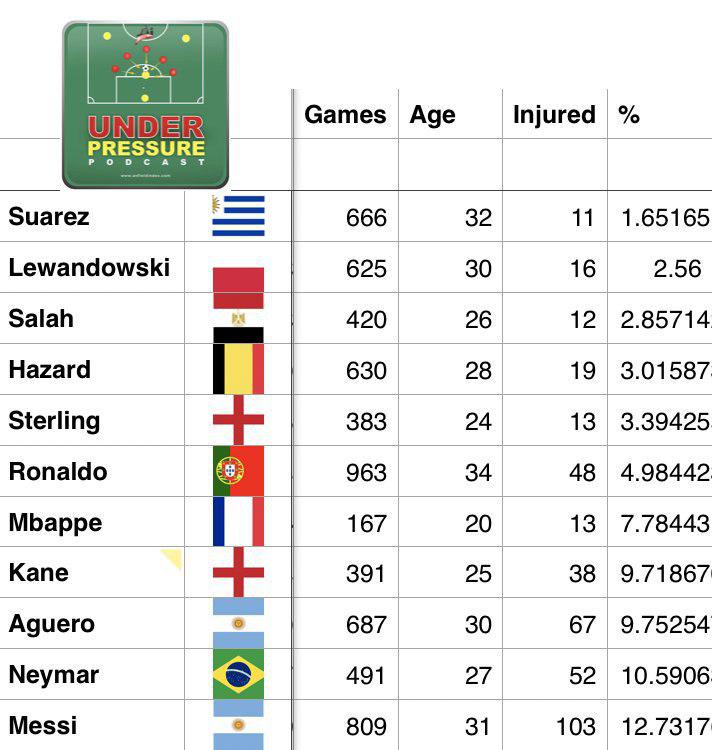 Для сравнения форвард «Ювентуса» Криштиану Роналду пропустил 48 матчей (4,98%), бразильская звезда «Пари Сен-Жермен» Неймар не сыграл из-за травм в 52 матчах (10,59%).