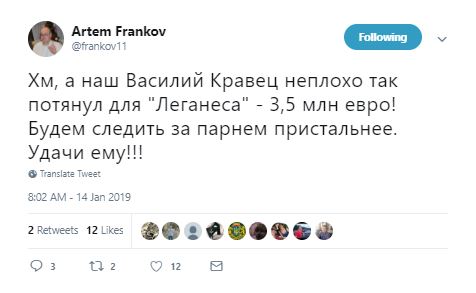 "Хм, а наш Василий Кравец неплохо так потянул для "Леганеса" - 3,5 млн евро! Будем следить за парнем пристальнее. Удачи ему!!!" - написал Артем в своем твиттере.