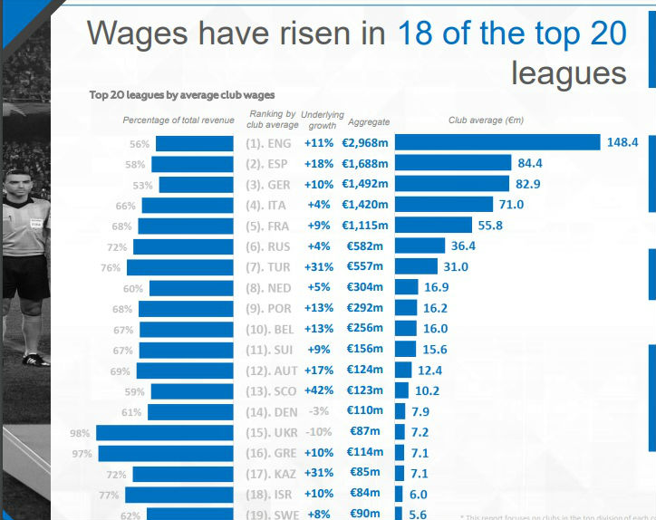 Согласно отчету УЕФА за 2017 финансовый год, который был опубликован на официальном сайте организации, лишь в Украине и Дании, среди топ-20 стран Старого Света, упали затраты клубов на заработные платы их футболистов.