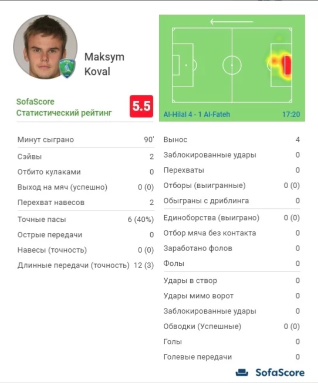 Аль-Фатех забил первым вышел вперед, но впоследствии в ворота Коваля было забито 4 мяча, один из которых с пенальти. Украинец в этом матче сделал только 2 сейва, а статистический портал SofaScore наградил Коваля самой низкой оценкой на две команды – 5,5, столько же имеет еще один защитник Аль-Фатеха.