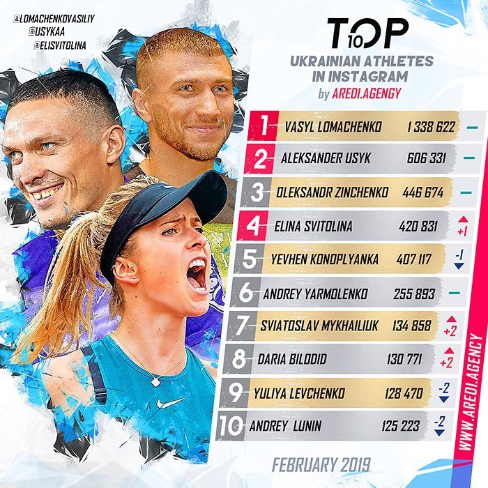 По количеству подписчиков в социальной сети продолжают лидировать чемпион мира в легком весе по версиям WBA и WBO Василий Ломаченко, абсолютный чемпион мира в первом тяжелом весе Александр Усик и футболист «Манчестер Сити» Александр Зинченко.